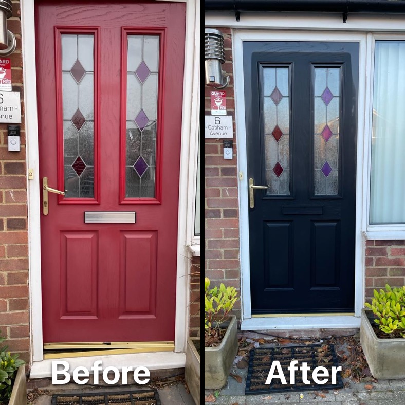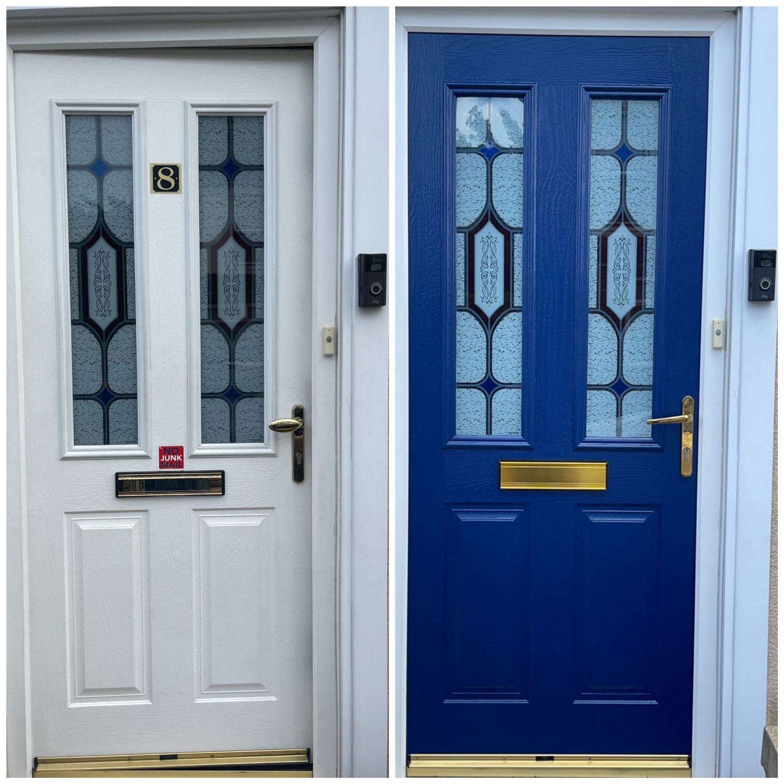 We use the same paint as our windows and so we can also guarantee the work for 10 years. Most of our customers simply want to change the colour of the door and not have to lay out £1,000’s on changing a new door. Not only can we save you £1,000’s we are helping the environment by not throwing away restorable doors.